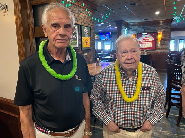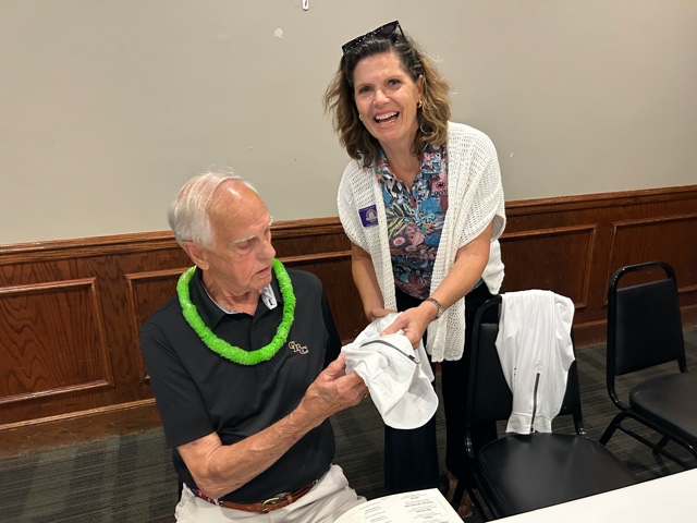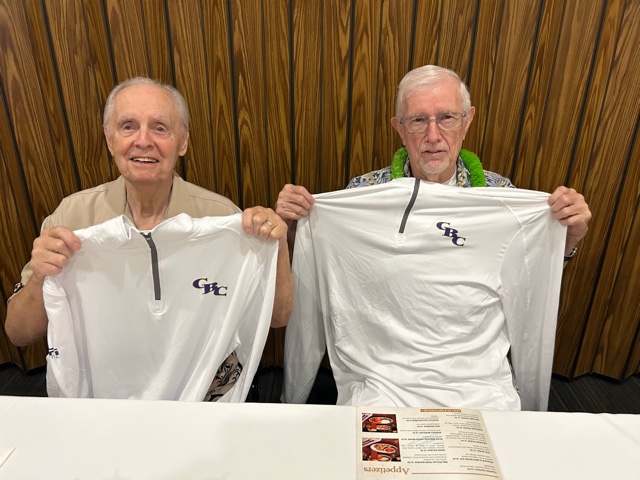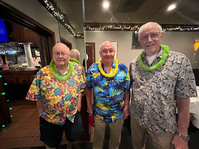 Our July lunch was a special occasion—not just the annual Hawaiian Shirt Day! Liz Millikan from CBCHS stopped by to hand out brand-new CBC shirts to everybody, and Val baked a batch of cookies for the lucky attendees!. Terry O'Brien managed to find 5 of the original lei necklaces from past Hawaiian Shirt Lunches to share. May, Monfort, Terry O'Brien, Pellegrini, Repovich, Vogelsang and Wiener were the lucky attendees!