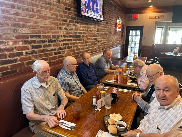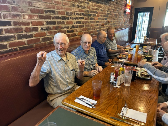 Our June lunch was an obviously happy affair. The 8 Cadets present ( Layton, May, Monfort, Terry O'Brien, Repovich, Tuminello, Vogelsang and Wiener) sure did enjoy the good company and food!