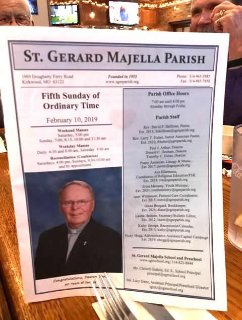 Deacon Tim, holding the program for his 30th Anniversary as Deacon! (See next photo) Charlie is anticipating a smile (I think).
