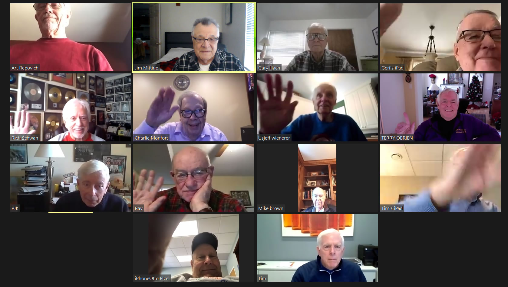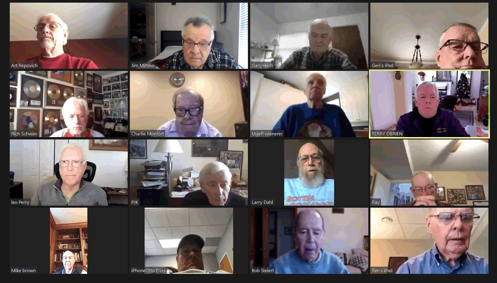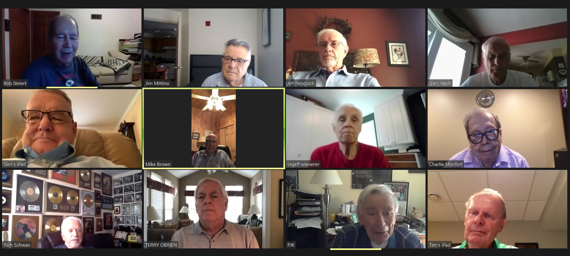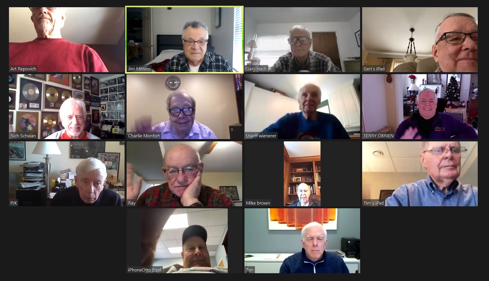 May 22 ZOOM Session (Screen 1)—L-R: (Top Row) Mittino, Bob Steiert, Jim Mercurio, Tim O'Brien