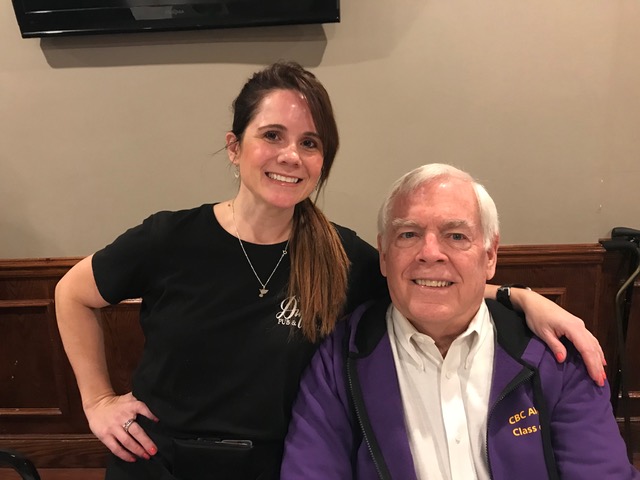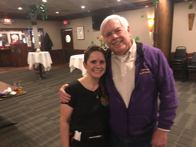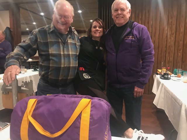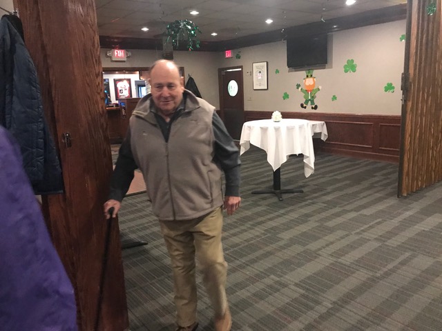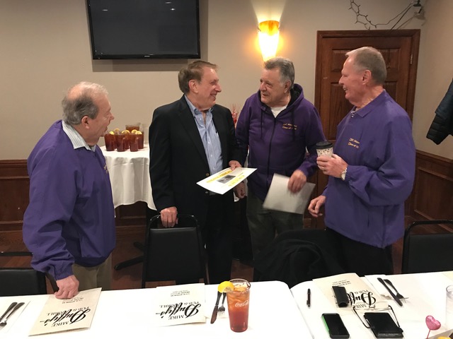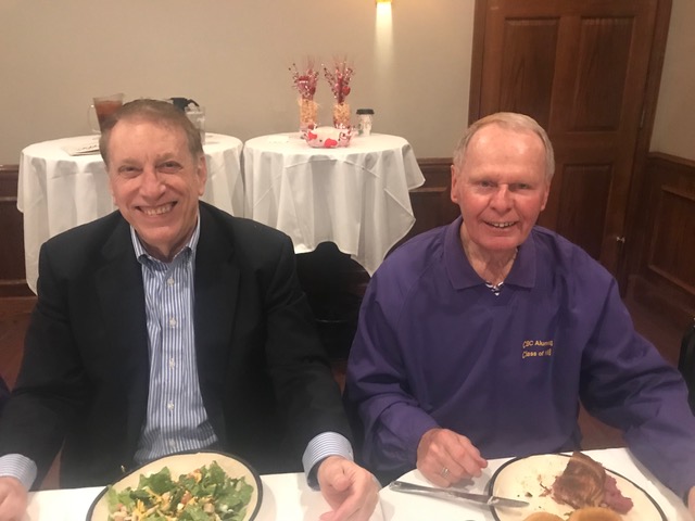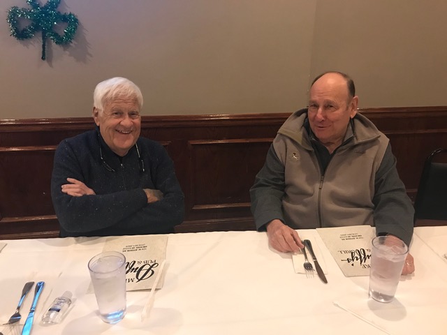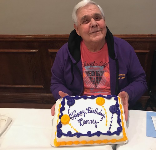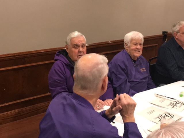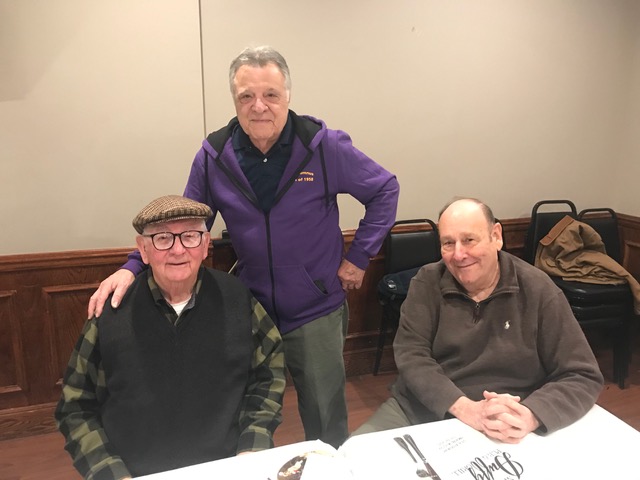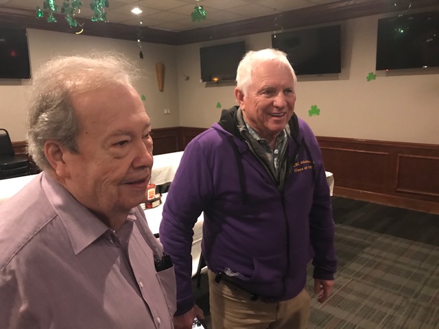 So good to see both Pete and Jeff again. Denny is celebrating the 65th anniversary of when Brother Paschal (inaccurately) foretold his future, which he gleefully reposted on the front of his shirt.
