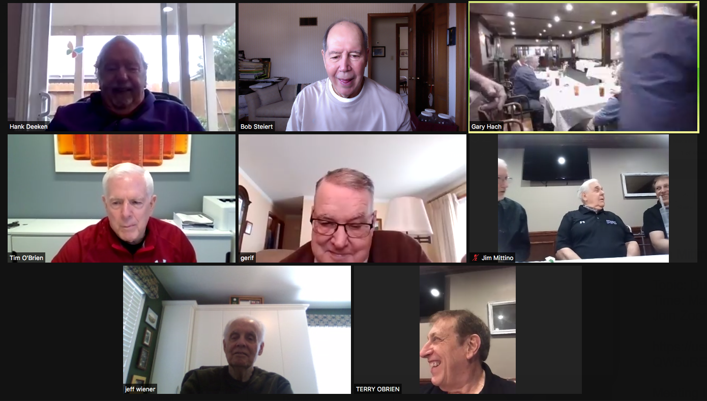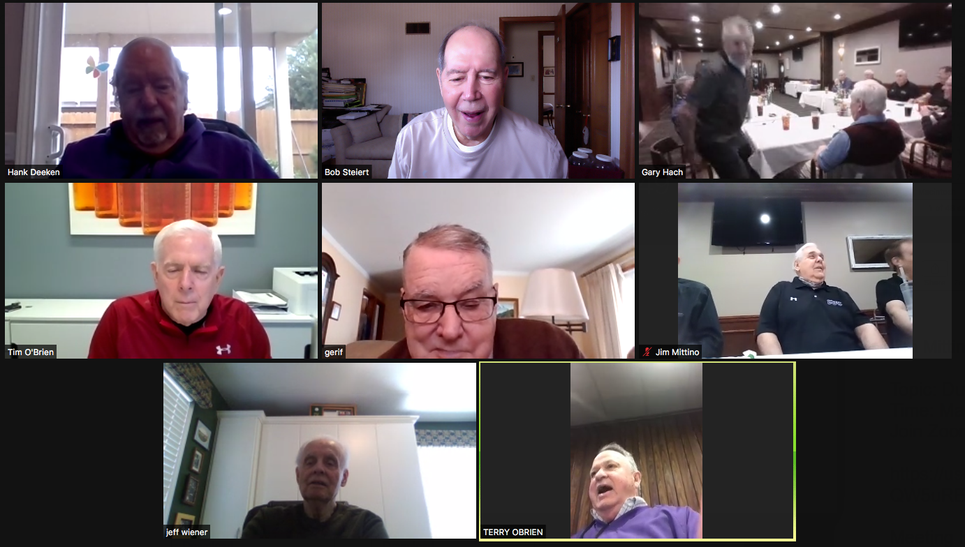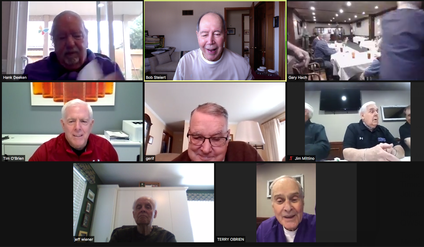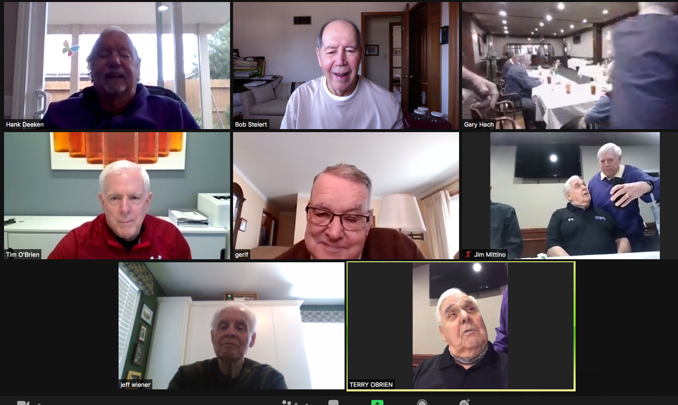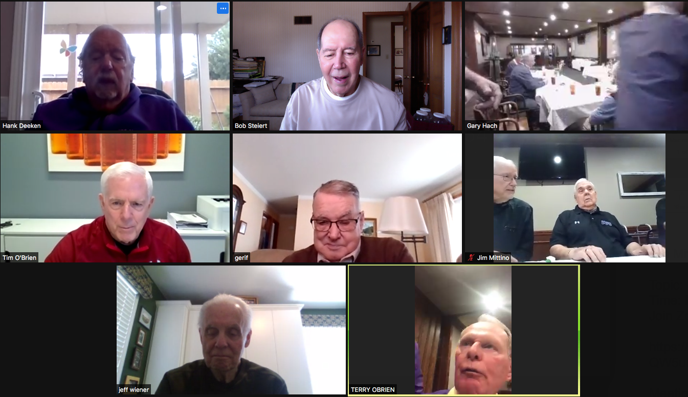 Zoom participants (Thanks to Bob Steiert for the screen captures): H. Deeken, G. Furi, P. Kenny, Tim O'Brien, R. Steiert and Jeff Wiener. (At Duffy's—Thanks to Terry O'Brien for the pictures: T. Dolan, D. Doyle, O. Etzel, G. Hach, J. Layton, J. Mittino, R. Muth, Terry O'Brien, A. Repovich, D. Reinhart. and A. Tumminello)