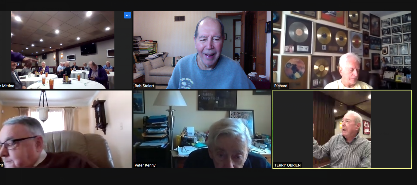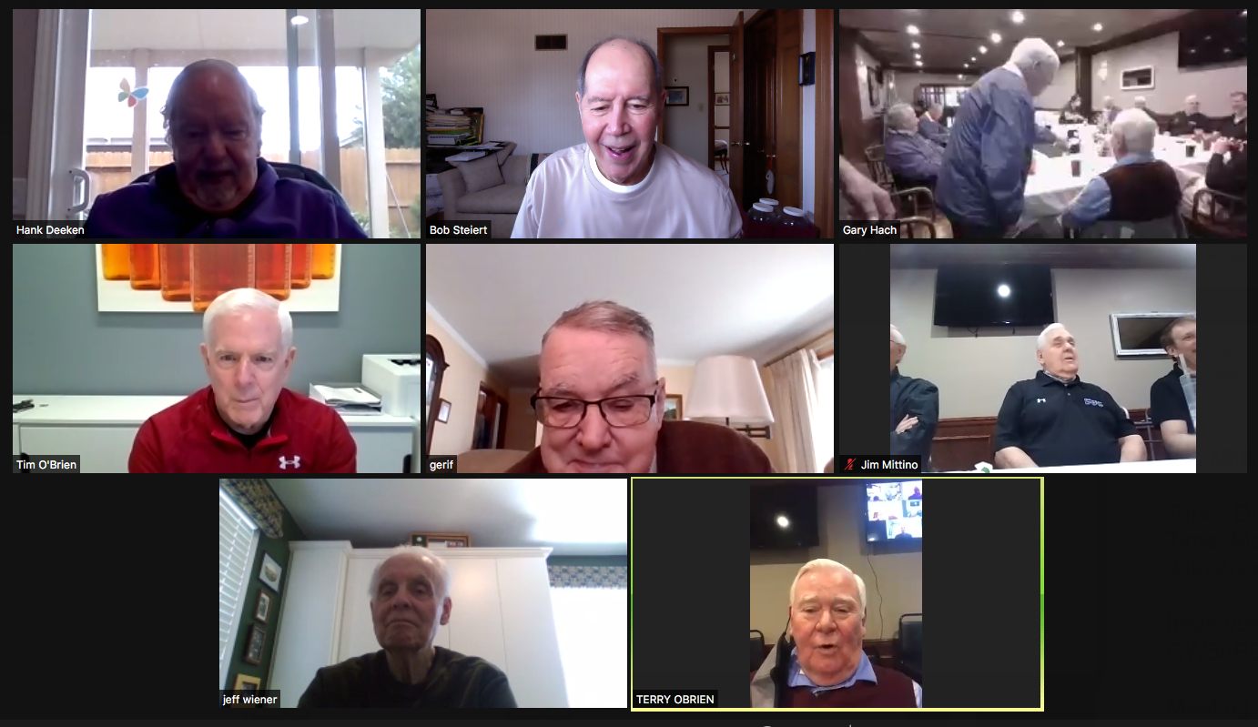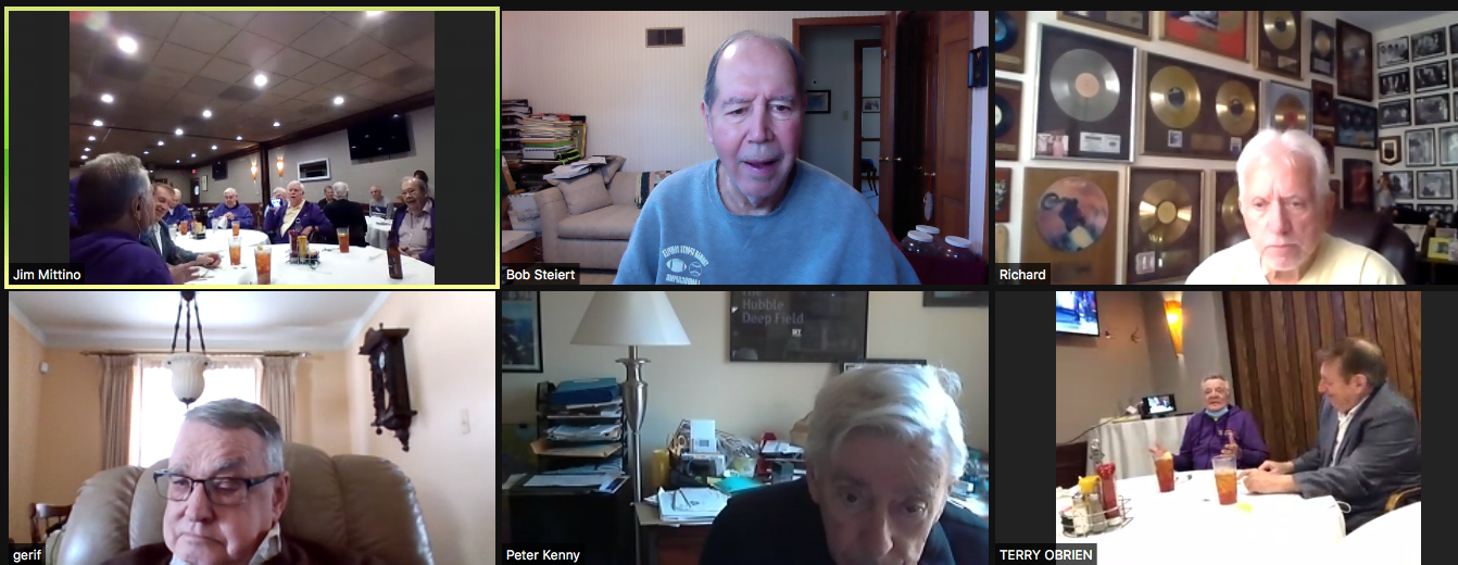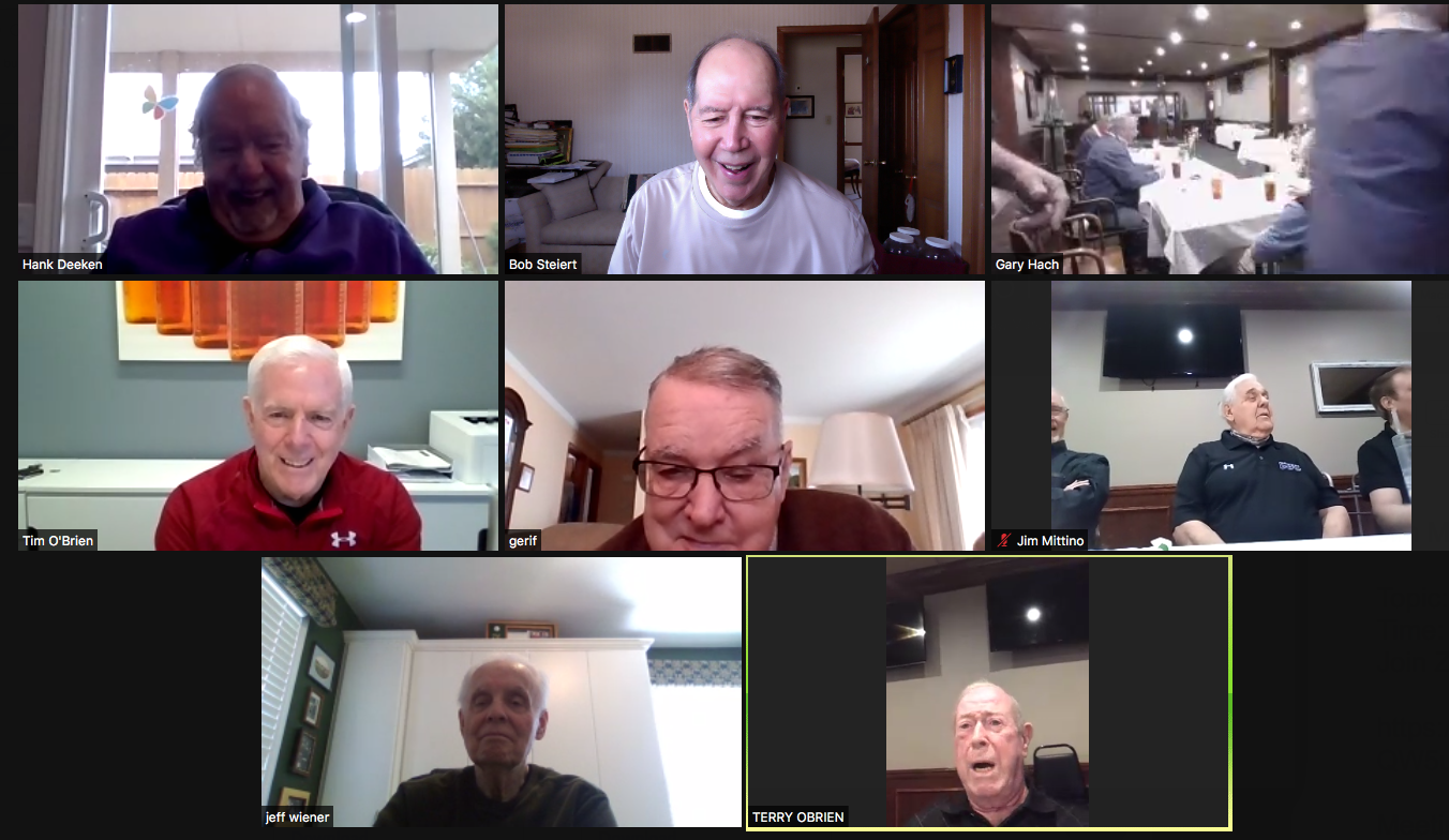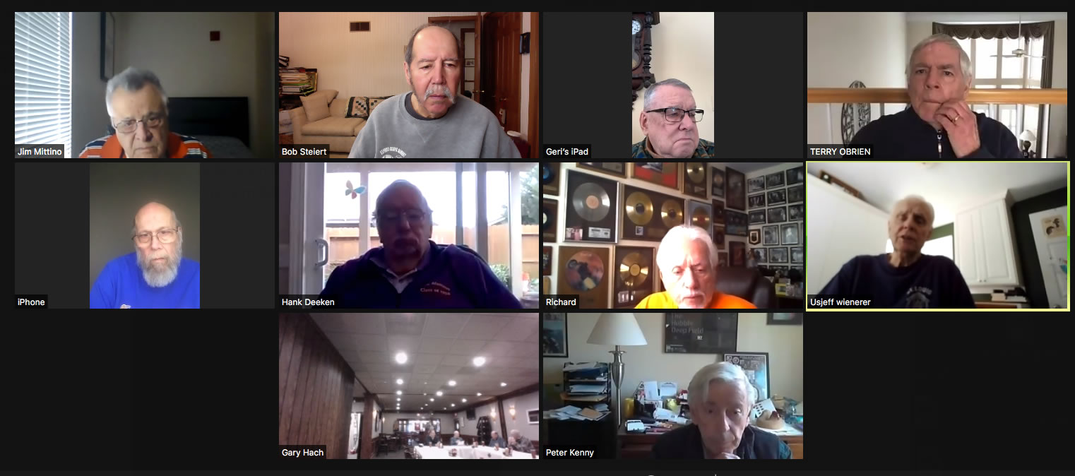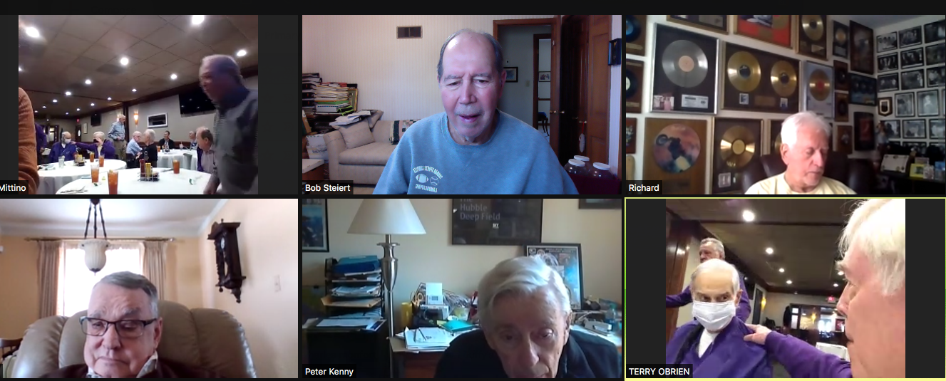 Zoom participants (Thanks to Bob Steiert for the screen captures): H. Deeken, G. Furi, P. Kenny, Tim O'Brien, R. Steiert and Jeff Wiener. (At Duffy's—Thanks to Terry O'Brien for the pictures: T. Dolan, D. Doyle, O. Etzel, G. Hach, J. Layton, J. Mittino, R. Muth, Terry O'Brien, A. Repovich, D. Reinhart. and A. Tumminello)