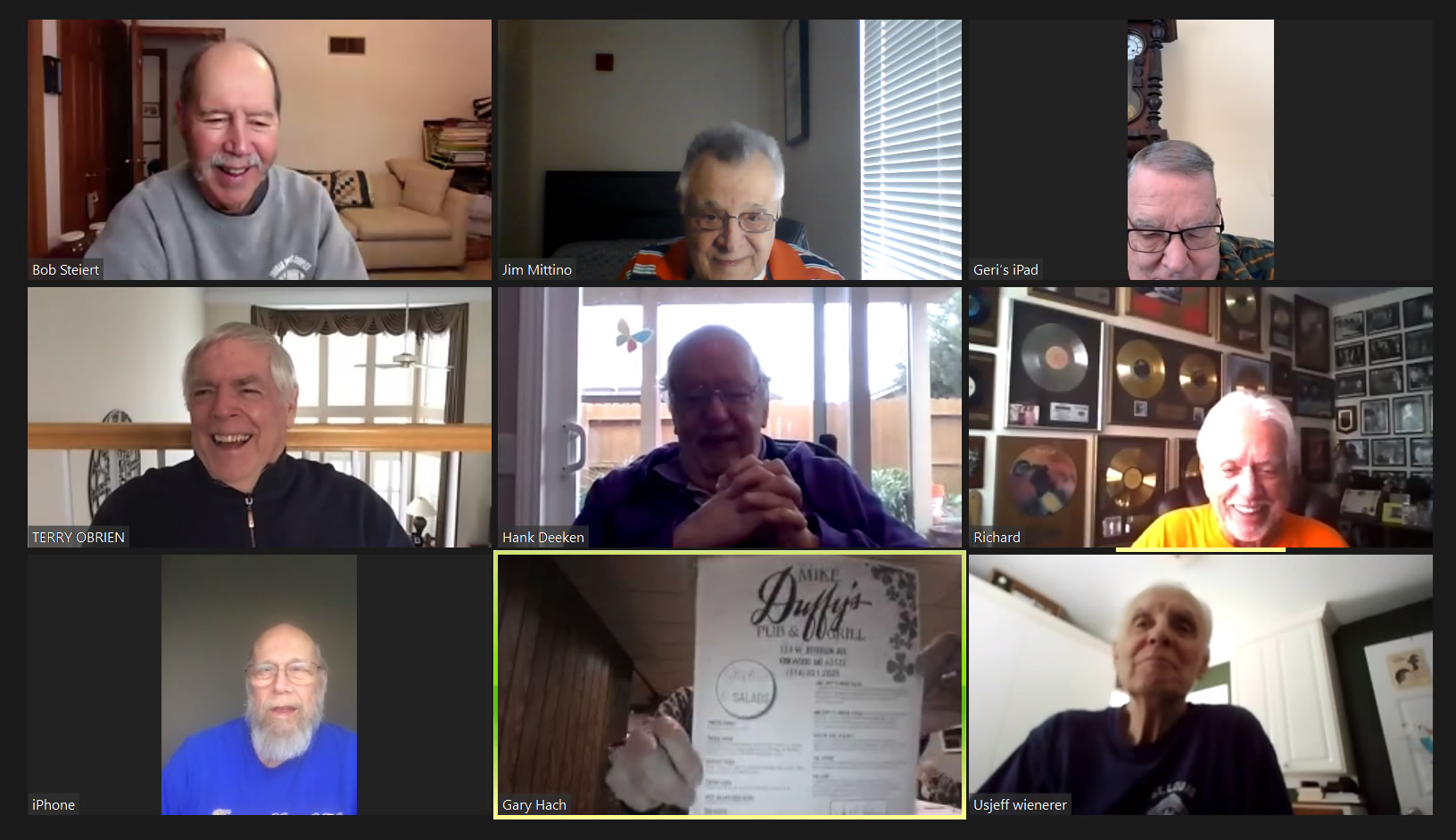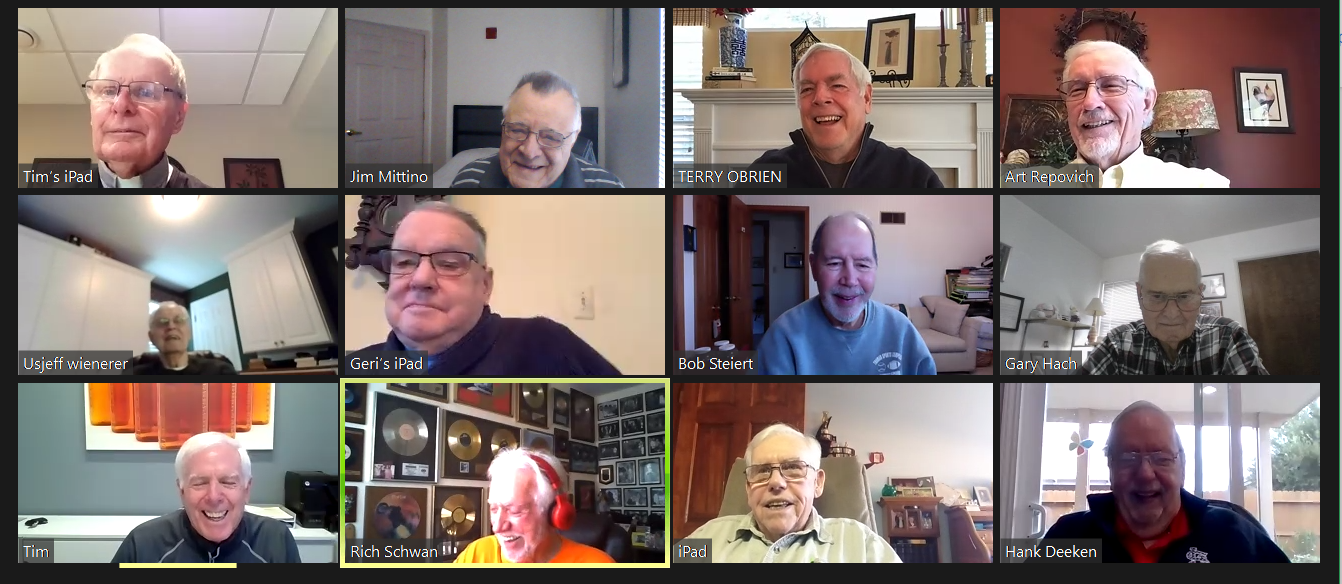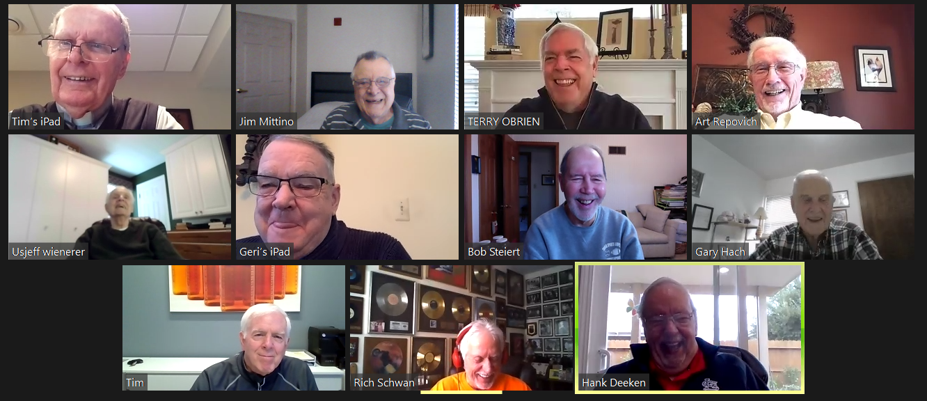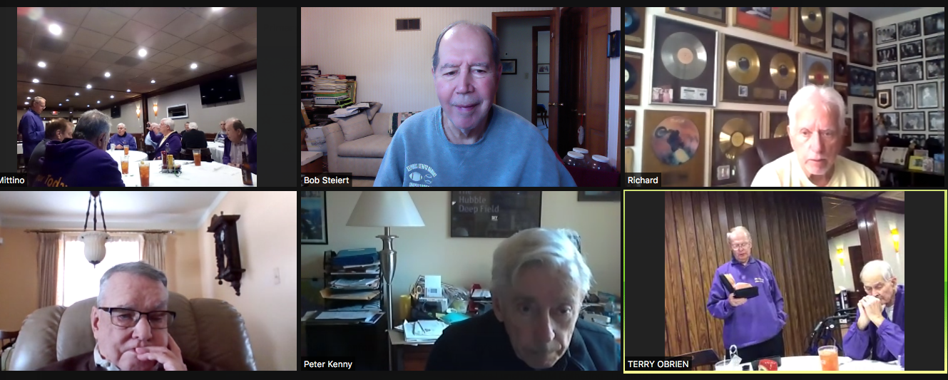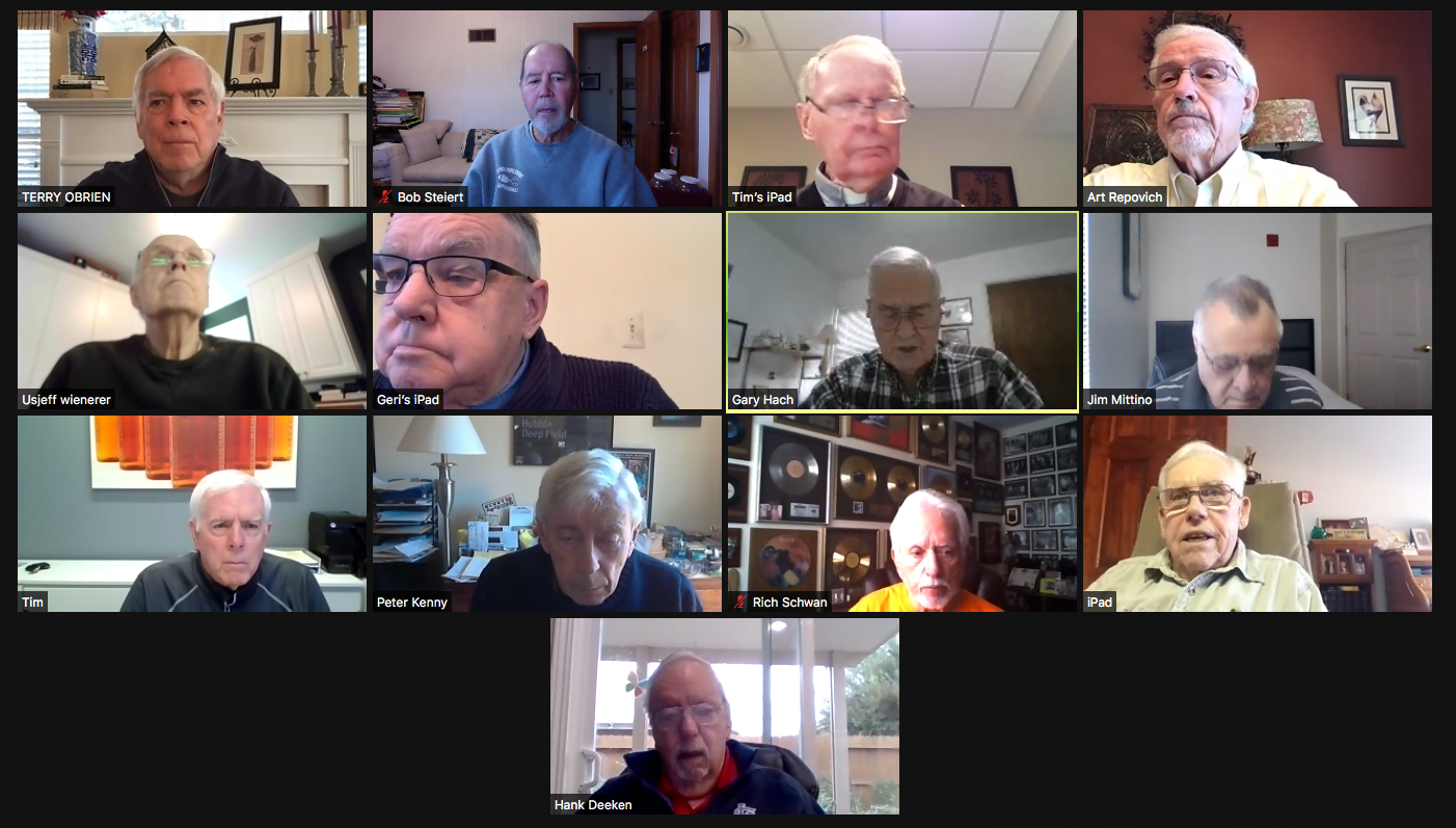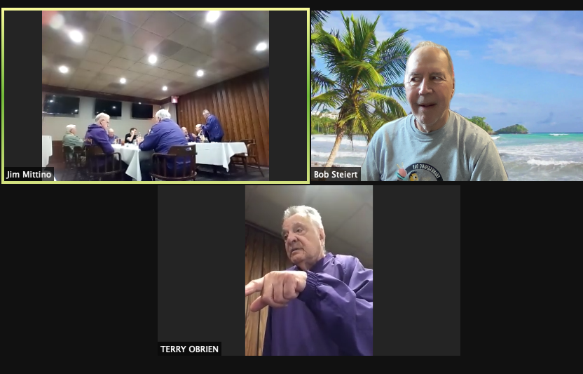 Zoom participants (Thanks to Bob Steiert for the screen captures): H. Deeken, G. Furi, P. Kenny, Tim O'Brien, R. Steiert and Jeff Wiener. (At Duffy's—Thanks to Terry O'Brien for the pictures: T. Dolan, D. Doyle, O. Etzel, G. Hach, J. Layton, J. Mittino, R. Muth, Terry O'Brien, A. Repovich, D. Reinhart. and A. Tumminello)
