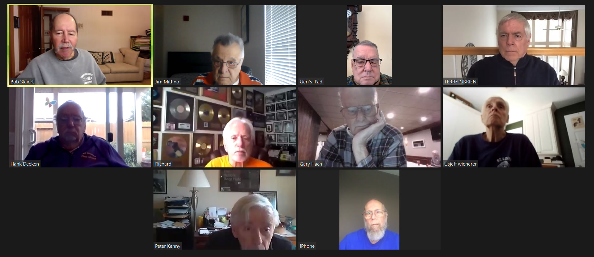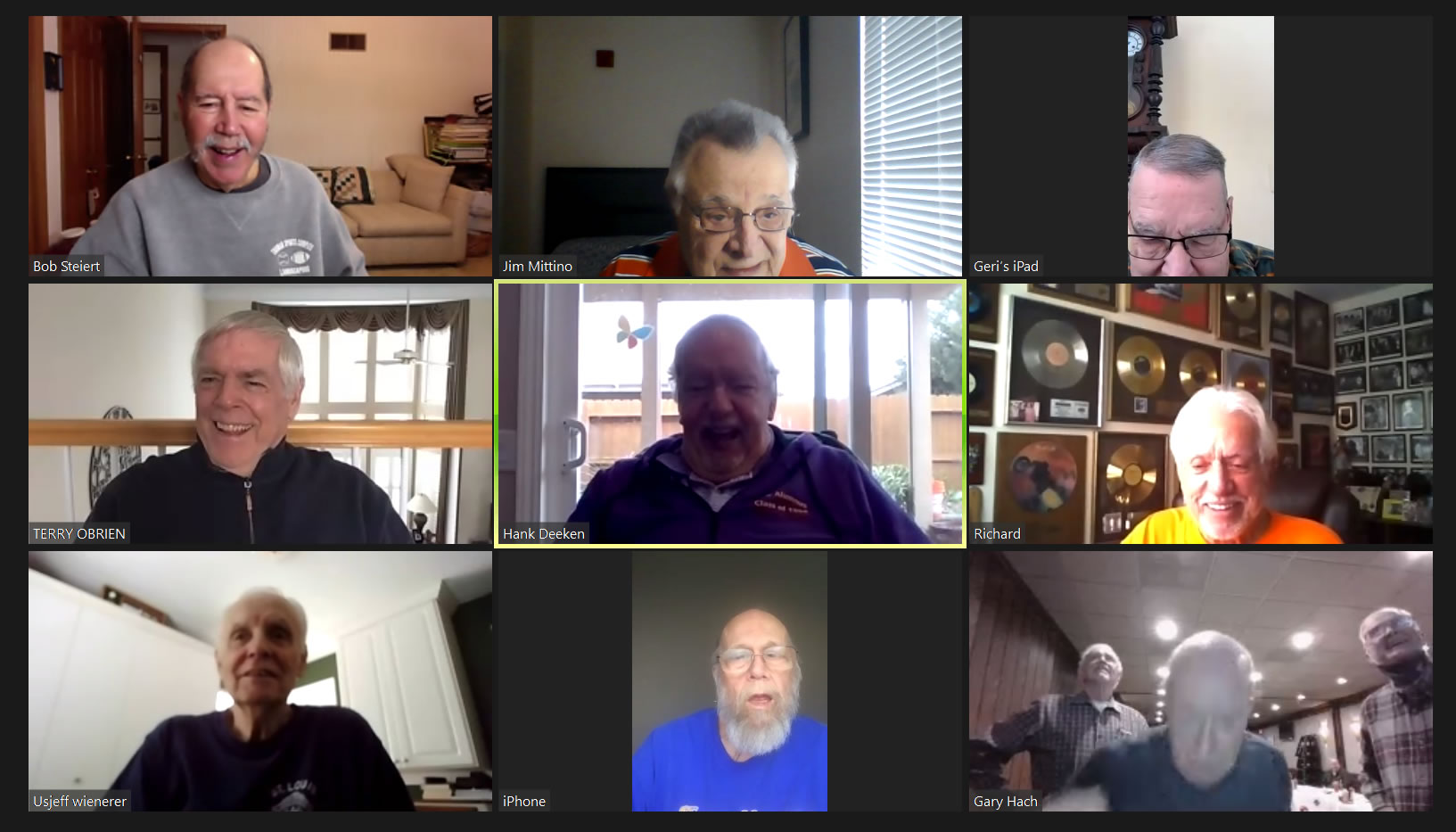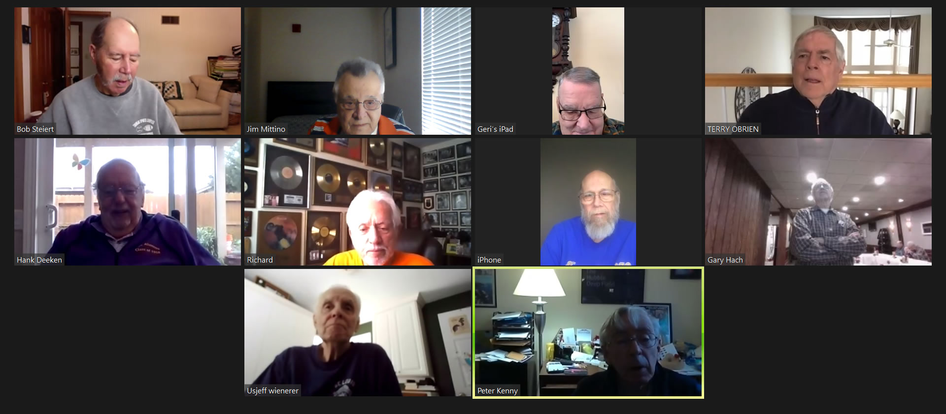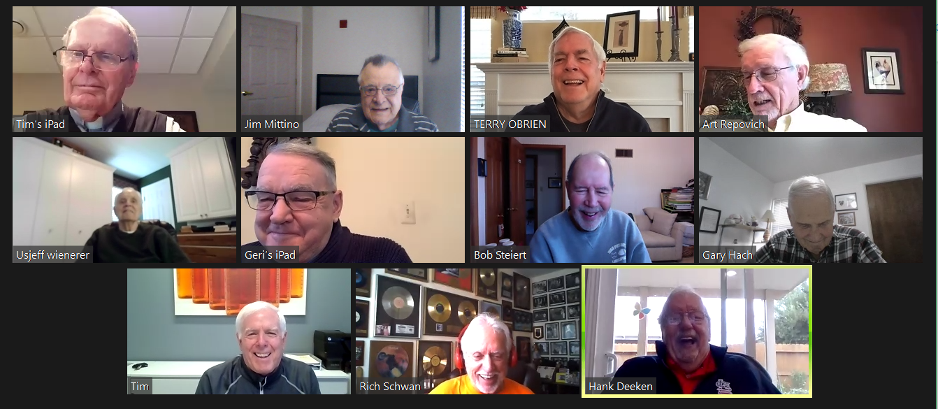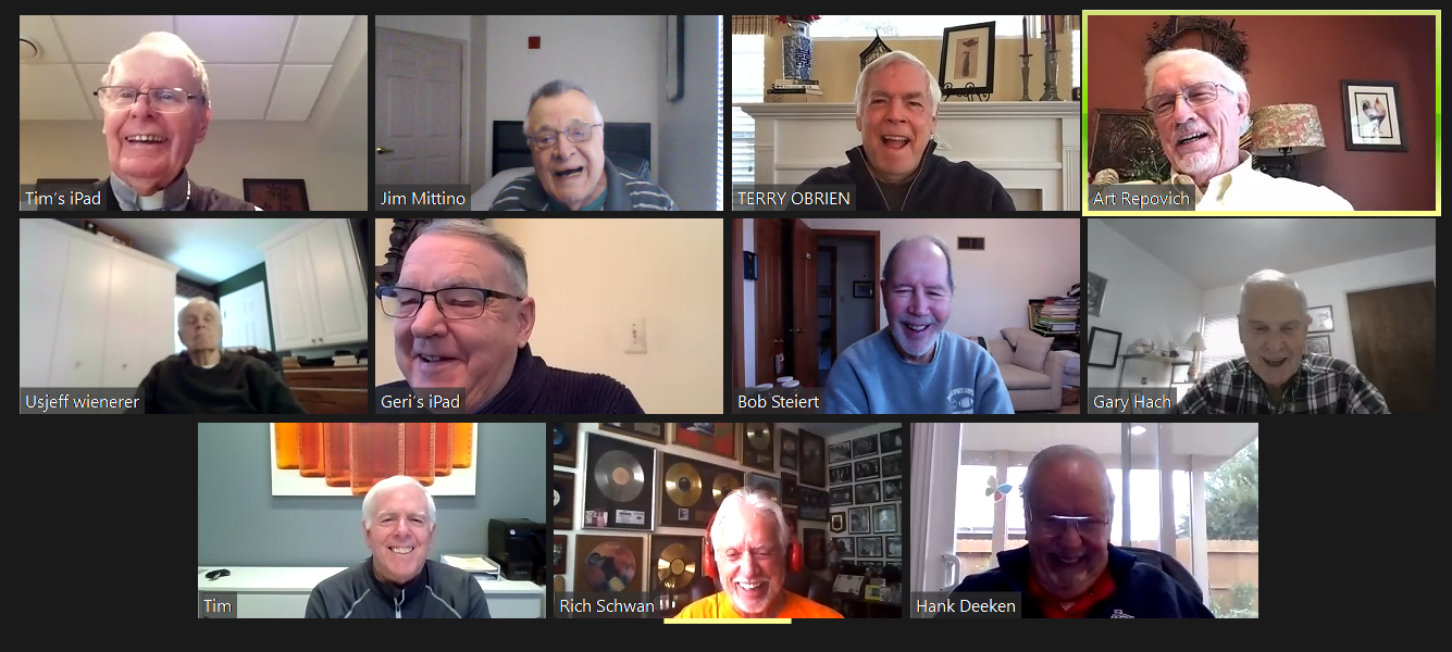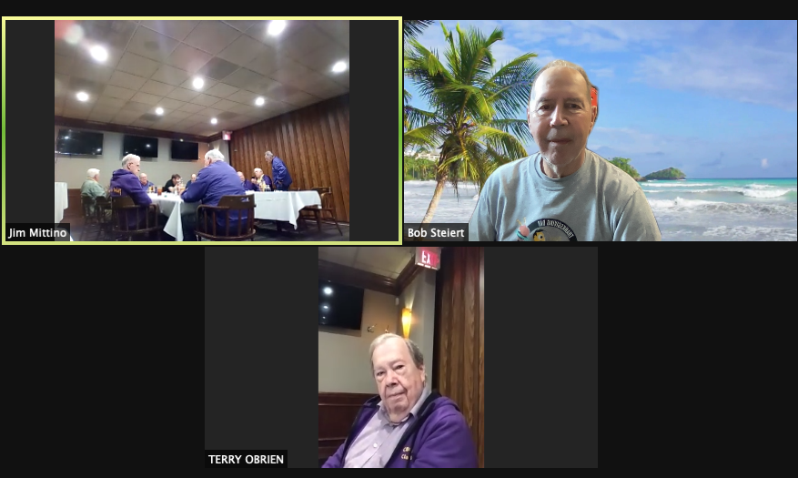 Zoom participants (Thanks to Bob Steiert for the screen captures): H. Deeken, G. Furi, P. Kenny, Tim O'Brien, R. Steiert and Jeff Wiener. (At Duffy's—Thanks to Terry O'Brien for the pictures: T. Dolan, D. Doyle, O. Etzel, G. Hach, J. Layton, J. Mittino, R. Muth, Terry O'Brien, A. Repovich, D. Reinhart. and A. Tumminello)