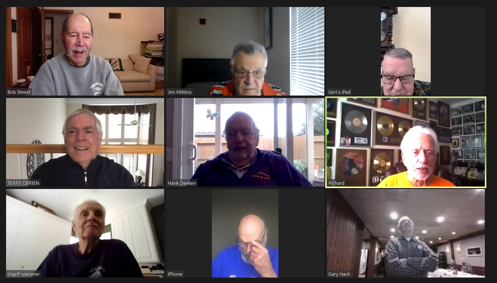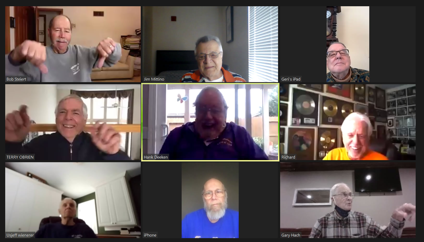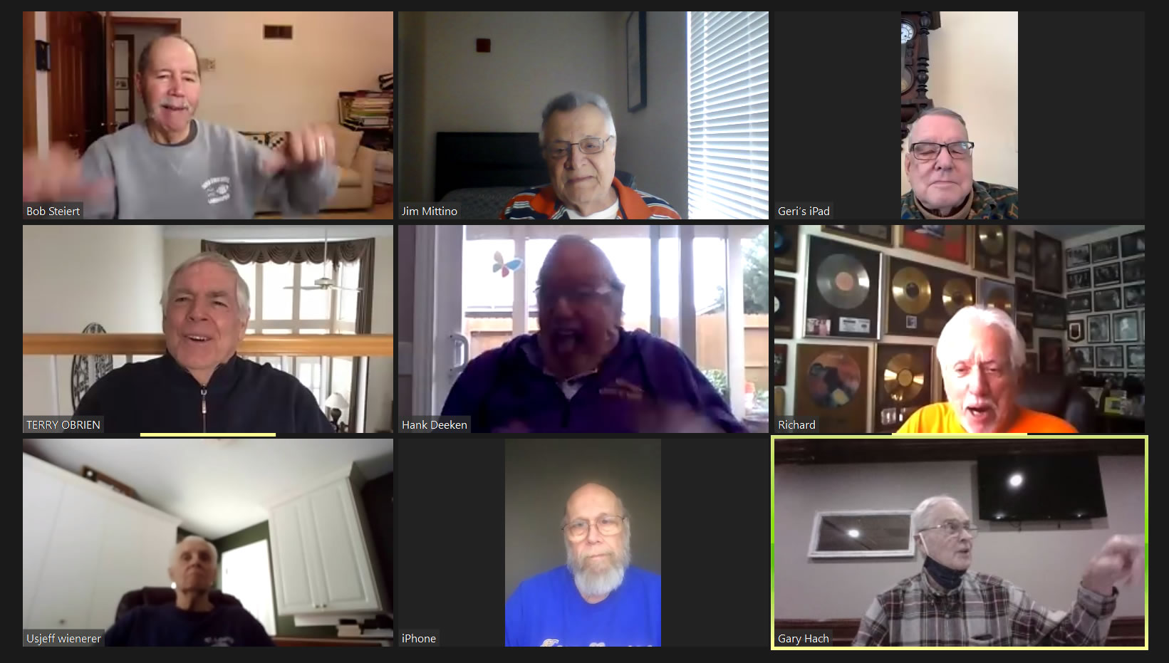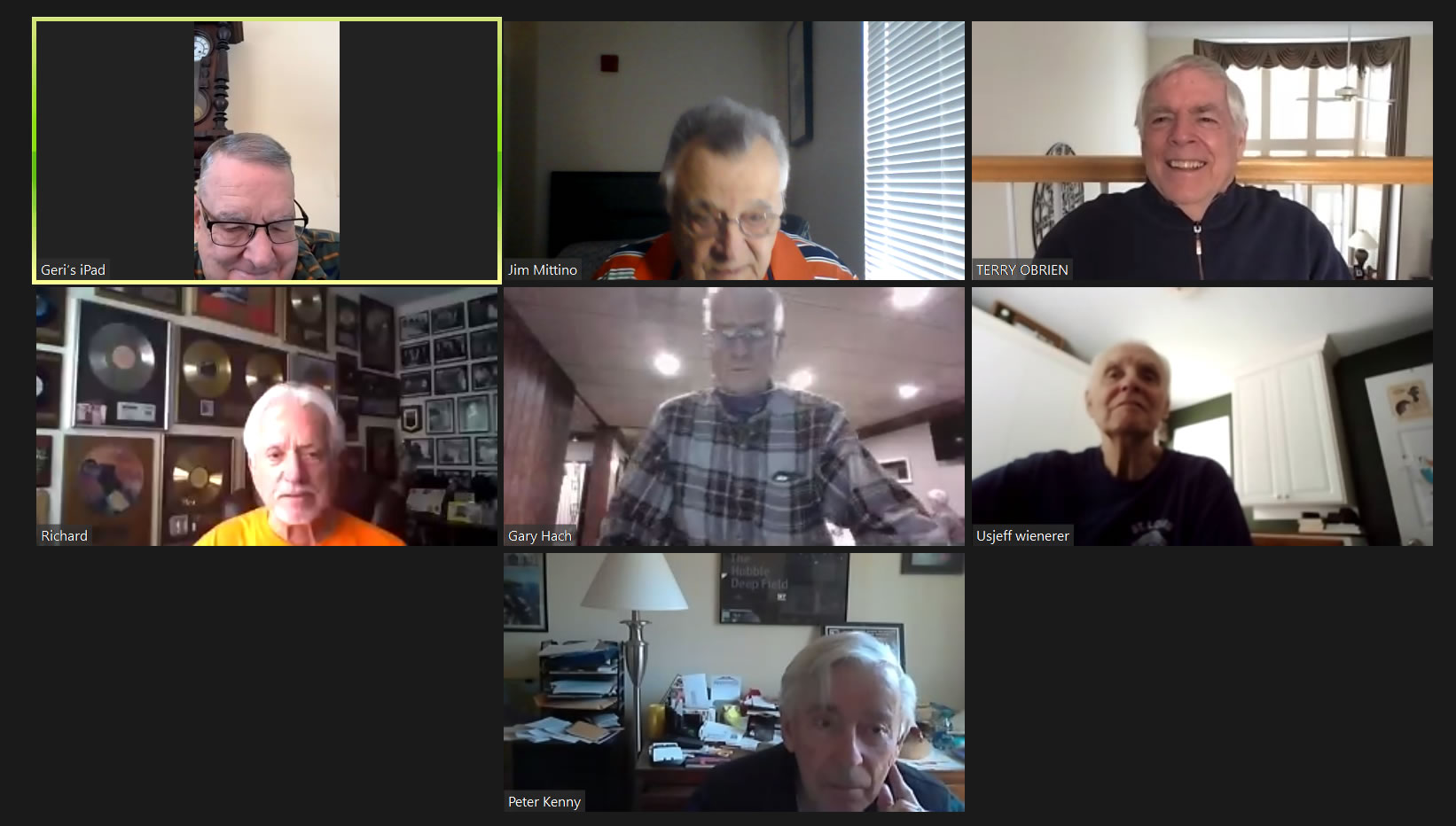 Zoom participants (Thanks to Bob Steiert for the screen captures): H. Deeken, G. Furi, P. Kenny, Tim O'Brien, R. Steiert and Jeff Wiener. (At Duffy's—Thanks to Terry O'Brien for the pictures: T. Dolan, D. Doyle, O. Etzel, G. Hach, J. Layton, J. Mittino, R. Muth, Terry O'Brien, A. Repovich, D. Reinhart. and A. Tumminello)