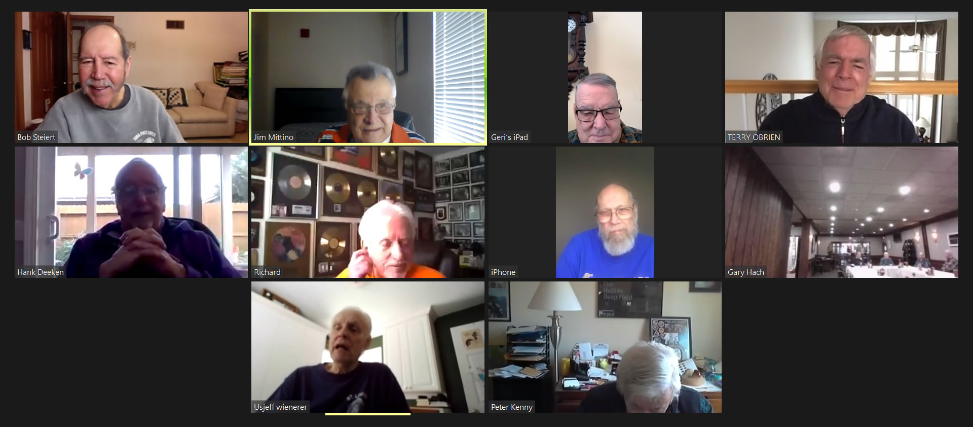 Zoom participants: L. Dahl, H. Deeken, G. Furi, P. Kenny, J. Mittino, Terry O'Brien, R. Schwan, R. Steiert and Jeff Wiener. (At Duffy's: G. Hach, J. Layton, A. Repovich, D. Reinhart. and A. Tumminello)
