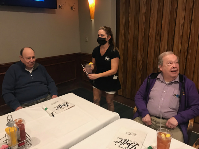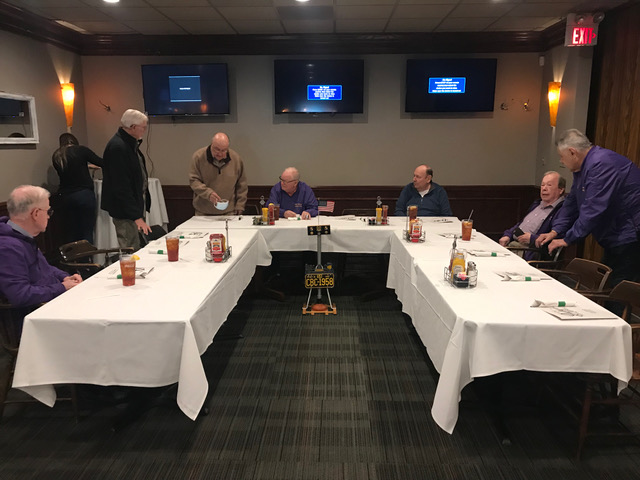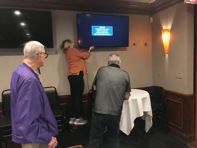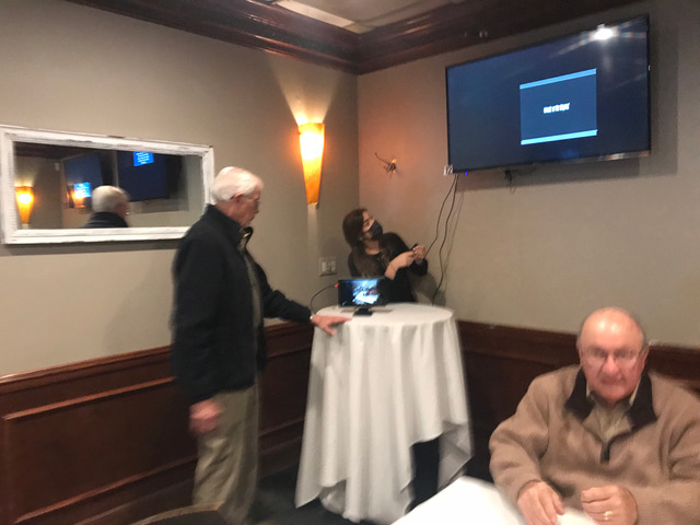 We were able to display the Zoom participants from across the country on the large TV screen at Duffy's and, thanks to Terry's phone, feature all the in-person attendees one by one with the Zoom participants on their screens. Gary Hach's Chromebook enabled the Zoom viewers to see the banquet room too.