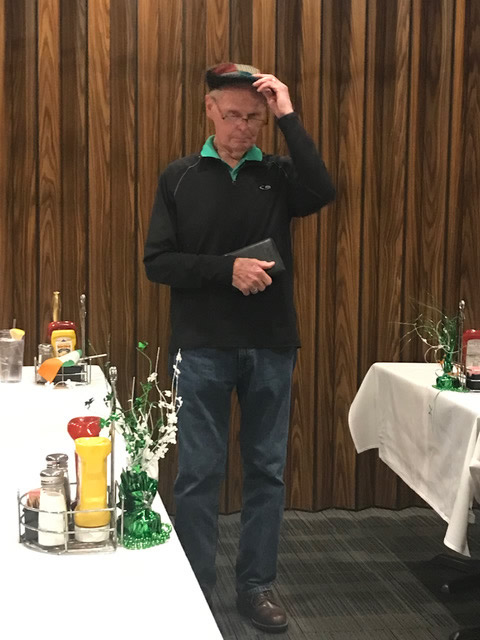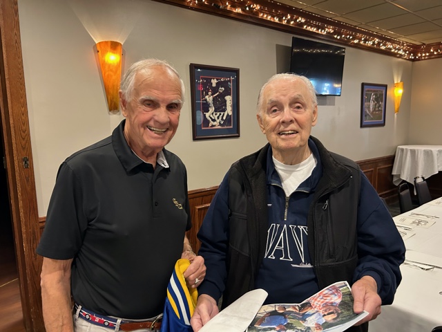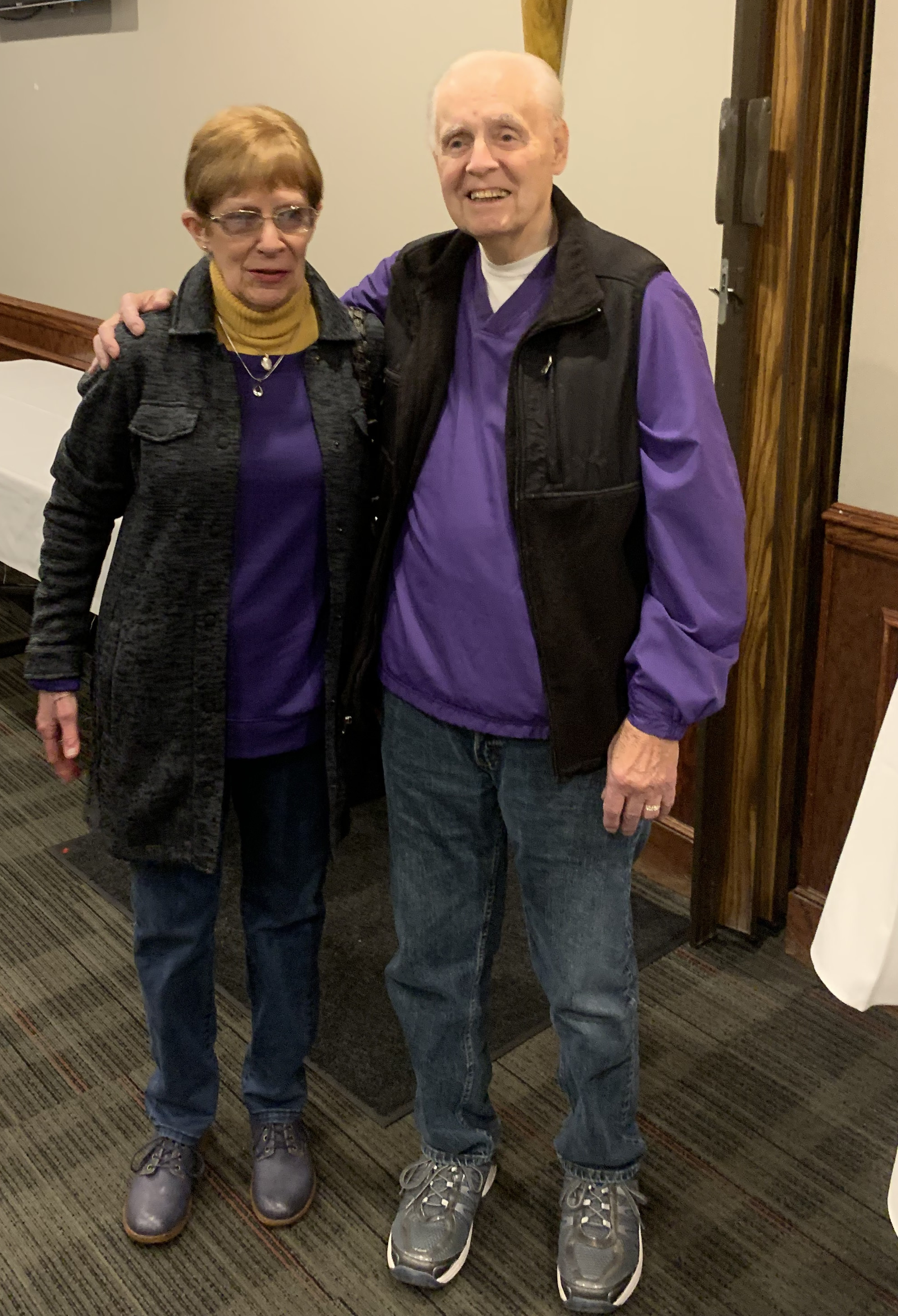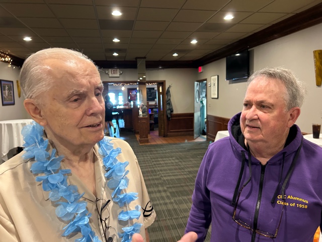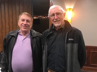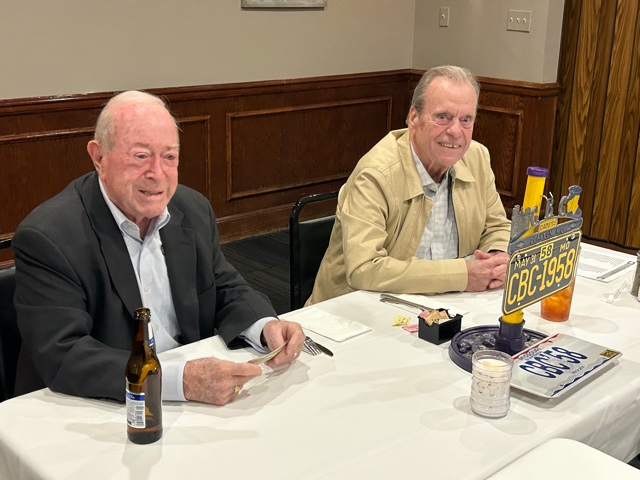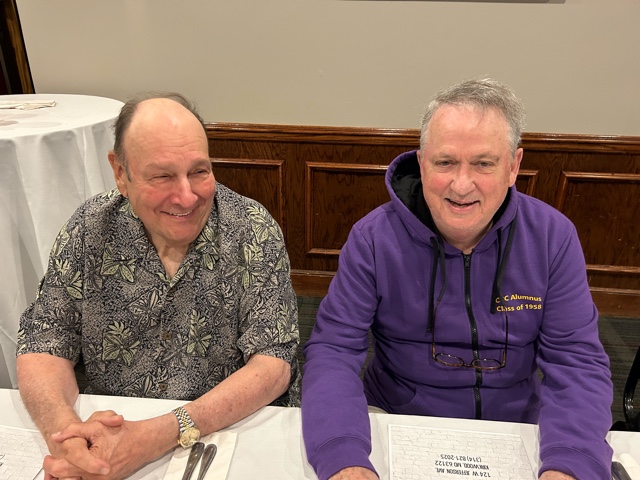 A surprise guest—Carla Reinhart—with Jeff. Carla brought a sheet cake honoring the Class. She is also continuing Denny's tradition of calling each Class of 1958 member on their Birthday!