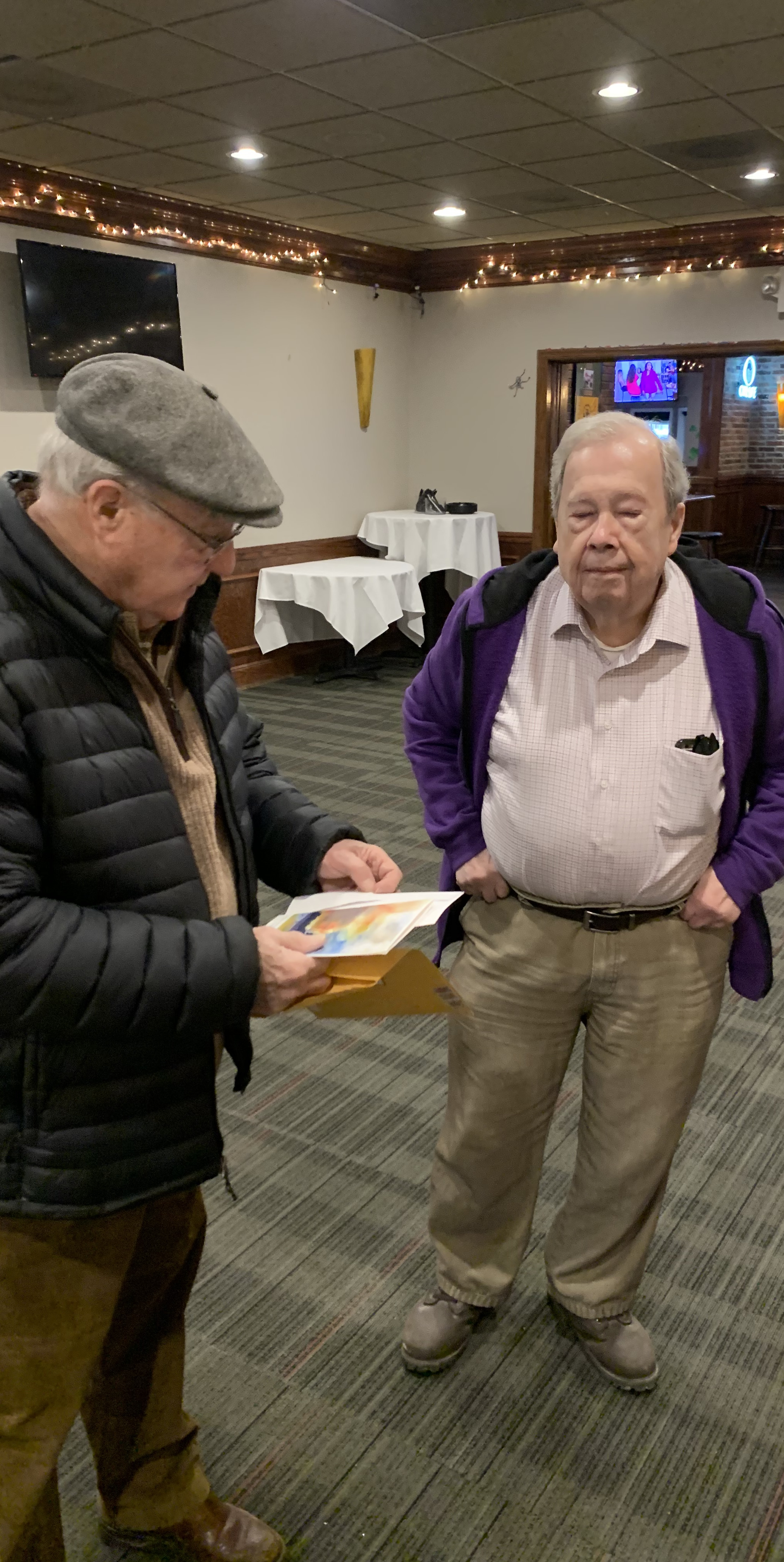 Frank is holding the hand-painted watercolor card Frank Windler made to remember Denis Reinhart, as Charlie Monfort looks on.