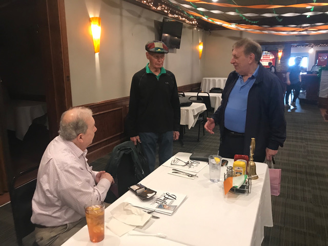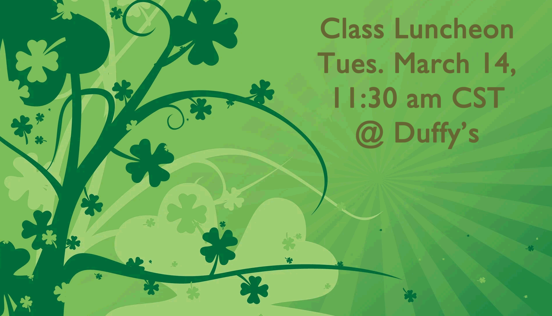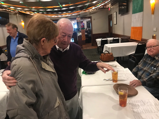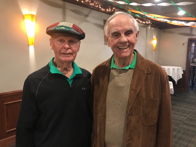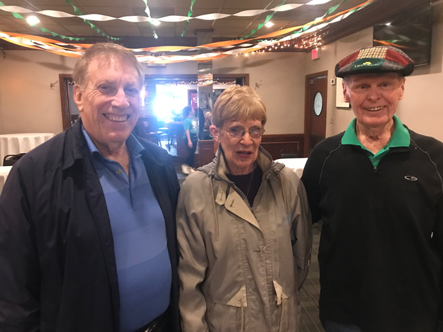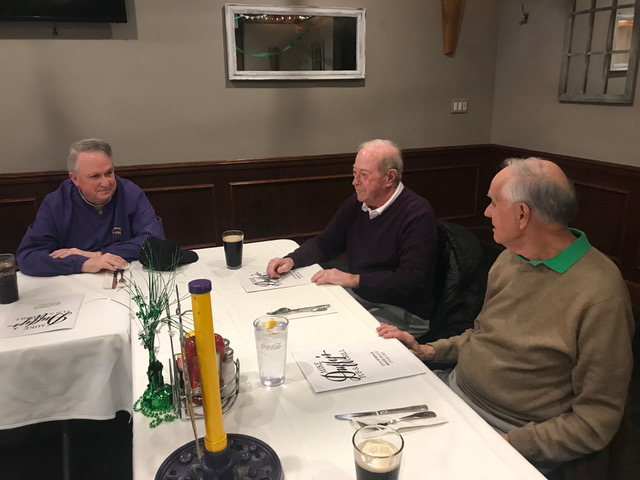 In advance of St. Patrick's Day, we had a good showing of claasmates: Tim Dolan, Dick Doyle, John Layton, John May,Charlie Monfort, Terry O'Brien, Frank Pellegrini, Art Repovich, Tony Tumminello, Jim Vogelsang, and Jeff Wiener, with Carla Reinhart as a special Guest.
