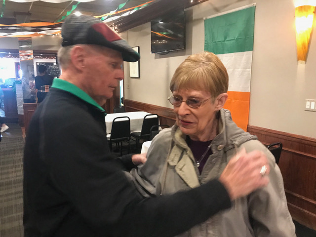 Tim welcomes John May. Note that Tim is earing a green Irish scally cap and shirt, whle John is wearing a green sweater and green shirt. After all, 'tis the day for the wesaring of the Green (in an establishment named Duffy's!)