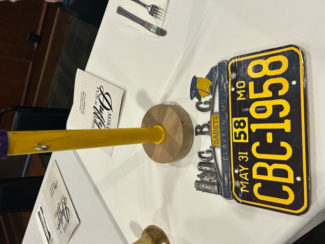 Tom Maher's old cardboard fake license plate lays forlornly on the table. But Frank has hand-crafted a new stand to replace the damaged one!