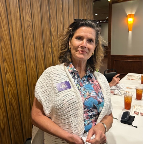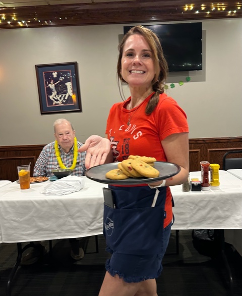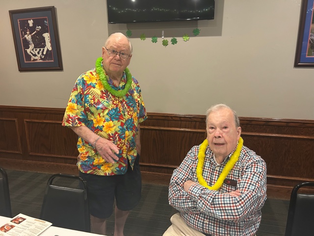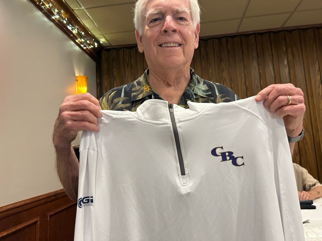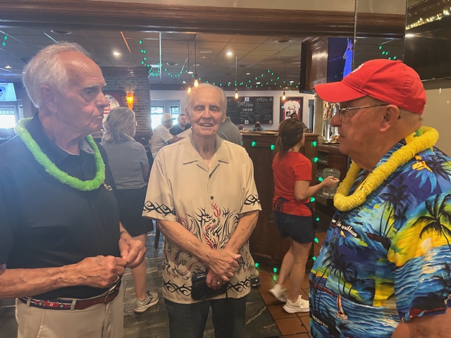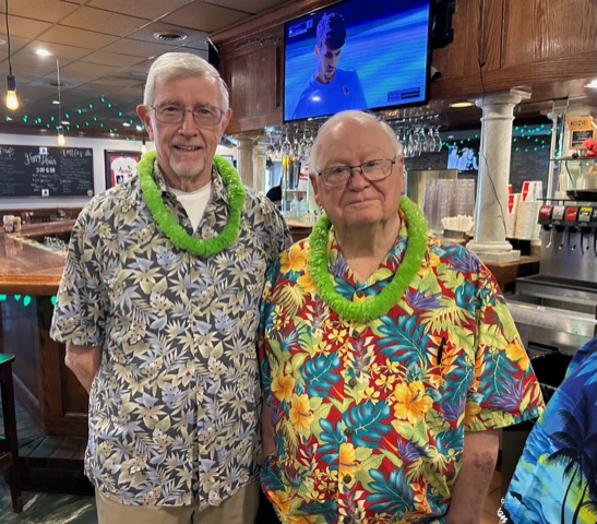 Our July lunch was a special occasion—not just the annual Hawaiian Shirt Day! Liz Millikan from CBCHS stopped by to hand out brand-new CBC shirts to everybody, and Val baked a batch of cookies for the lucky attendees!. Terry O'Brien managed to find 5 of the original lei necklaces from past Hawaiian Shirt Lunches to share. May, Monfort, Terry O'Brien, Pellegrini, Repovich, Vogelsang and Wiener were the lucky attendees!