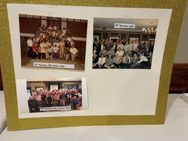 Tables at the room entrance were laden with name tags. Terry O'Brien prepared a display of mementos of our years together at CBC: a list of deceased class members, photos of Spring Flings and Anniversaries, and unforgettable characters.