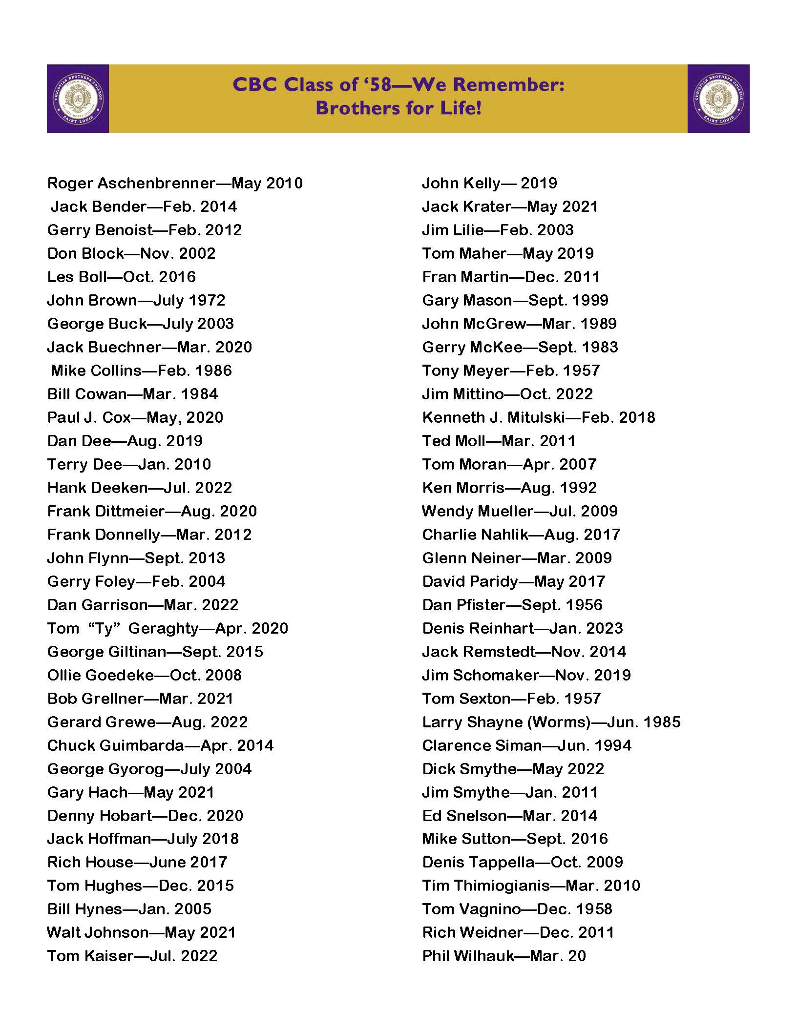A List of our Departed Brothers in the Class of 1958
